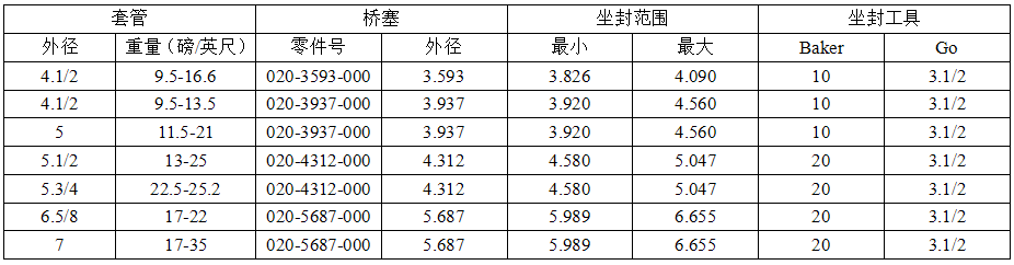 标准压裂桥塞可提供以一个 比较经济的临时封隔区域以供压裂或其他作业。该桥塞可以坐封在不同型号的电缆压力坐封工具上。